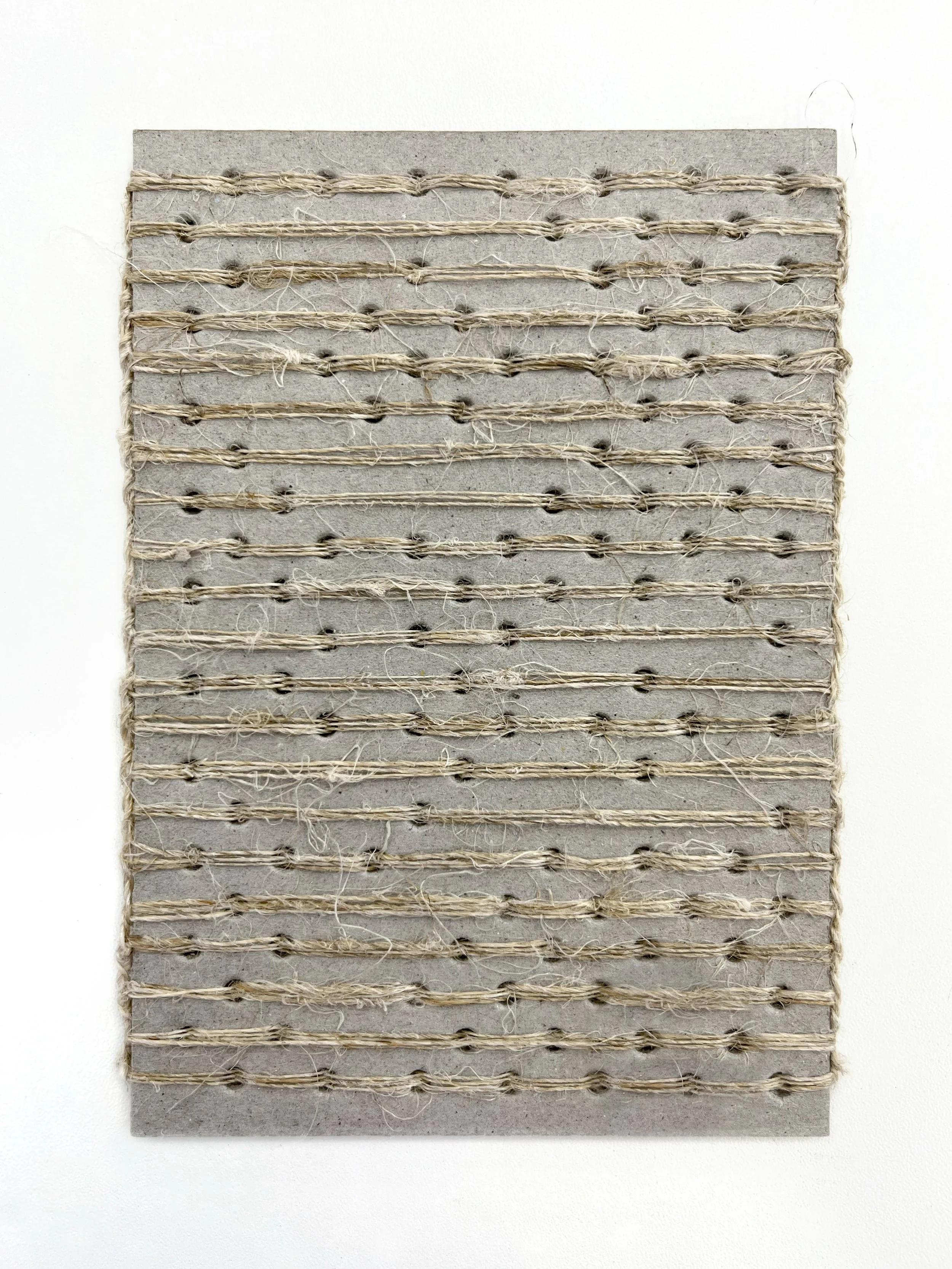 This act was followed by weaving the linen thread back and forth through the created openings. In doing so, a multi medial textured surface appeared, that refers to the making process (the famous punch cards) and woven result (the patterned linen textiles) of the first jacquard looms.